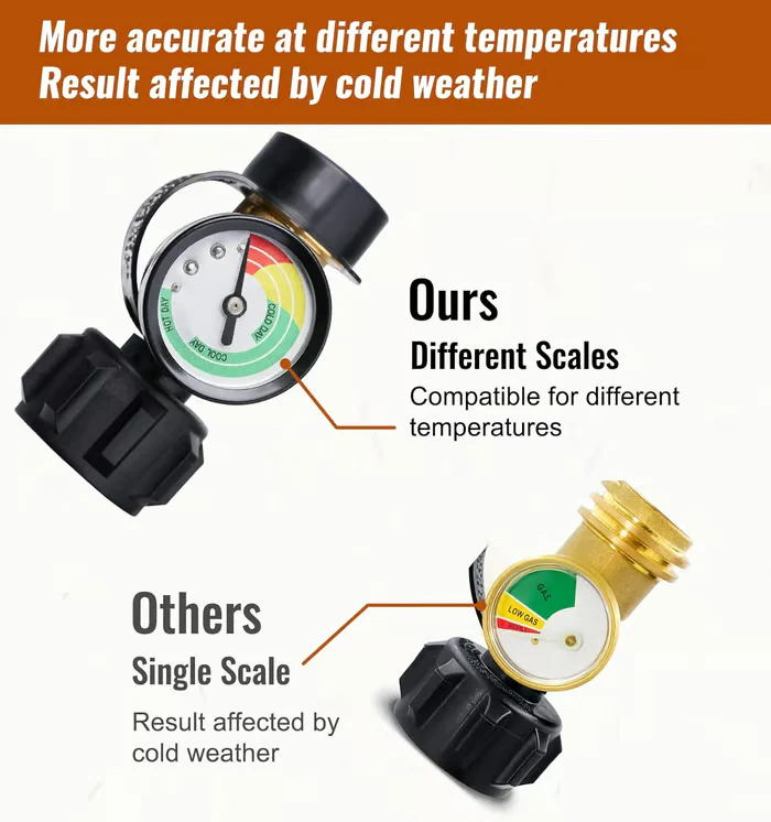 ADAPT TO DIFFERENT TEMPERATURES – As ambient temperature changes, the pressure in the tank will change, which may lead to wrong results for gas level with other normal propane gas gauges. To adapt to different climate, this PatioGem propane guage for tanks has 3 scales for hot day(≥ 68°F), cool day(≥50°F, ≤68°F) and cold day(≤50°F), always providing an accurate reading for your gas level.